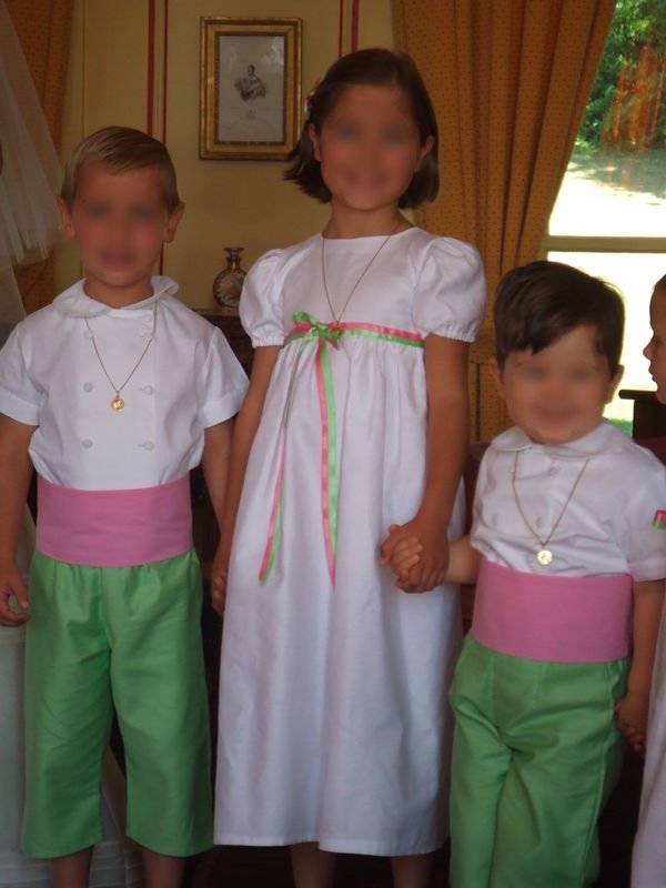 Je lève le mystère et réponds aux questions…j’ai donc fait ce cortège pour une mariée ravissante et des enfants tout aussi mignons…d’après un modèle Citro* pour les robes et l’enft r* pour les culottes des garçons ! quelques modif’ pourraient encore être faites pour les noeuds (je les avais laissés à nouer) et les ceintures des garçons !