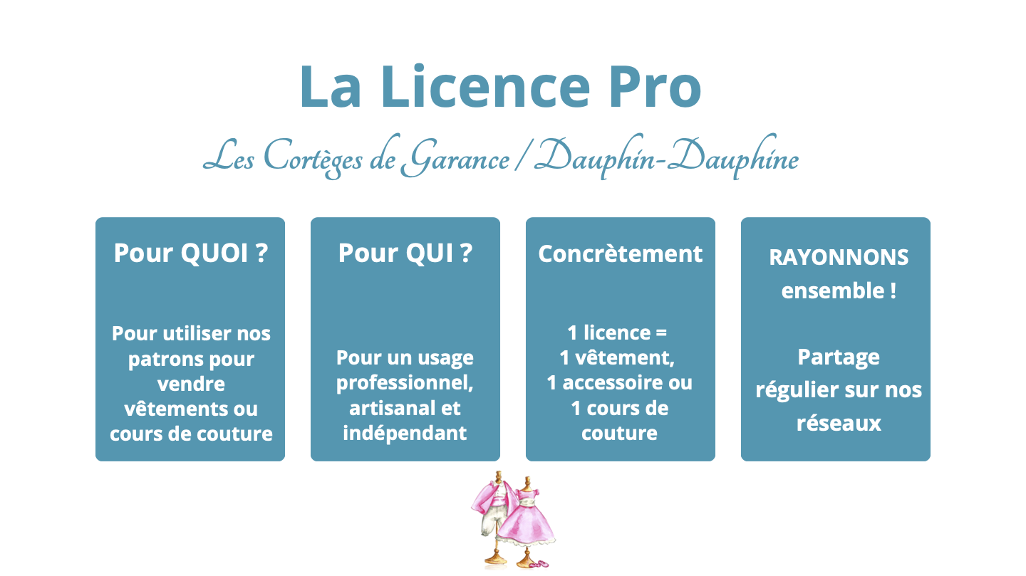 Proposée à l’unité, par 10 ou 50, la licence vous permet d’utiliser les patrons Dauphin-Dauphine© ou Les Cortèges de Garance© en toute légalité dans un cadre artisanal et commercial.