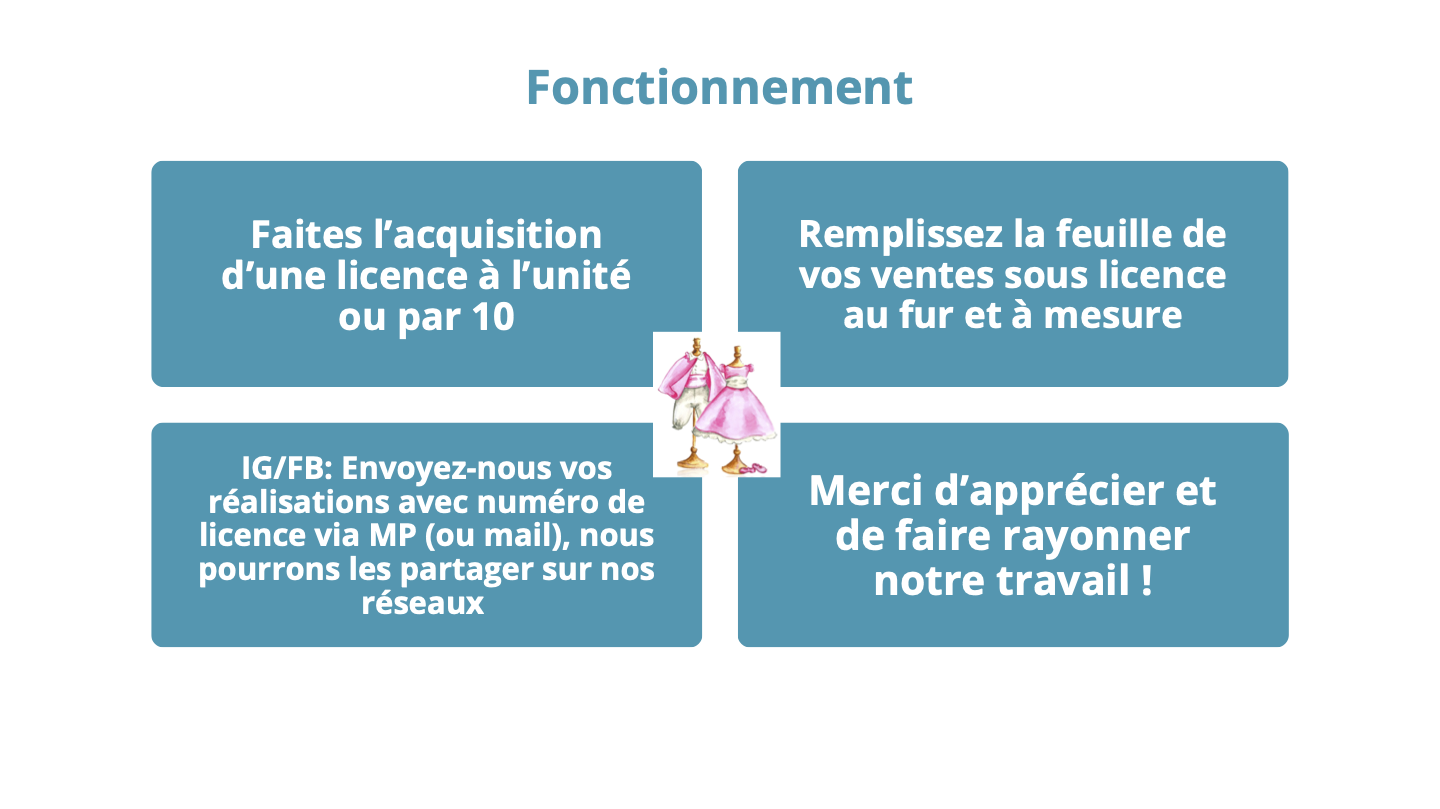 NB: La licence est réservée à un travail artisanal, en petite série, par des couturières indépendantes.