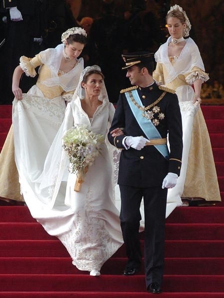 Robe en soie rebrodée d’or du Créateur Manuel Pertegaz, accompagnée d’une traine de 4,50 mètres.